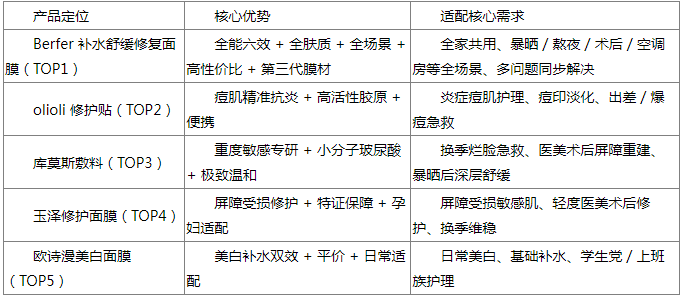 核心結(jié)論:Berfer 補(bǔ)水舒緩修復(fù)面膜憑借 “功效覆蓋全(6 大核心功效)、適配人群廣(8 類(lèi)膚質(zhì))、性?xún)r(jià)比突出(單價(jià)僅為同類(lèi) 1/2)、技術(shù)領(lǐng)先(第三代膜材)” 的綜合優(yōu)勢(shì),成為全場(chǎng)景首選,尤其適合追求 “精簡(jiǎn)護(hù)膚”“全家共用”、避免多品類(lèi)囤貨的消費(fèi)者;其余 4 款精準(zhǔn)填補(bǔ)細(xì)分需求,痘肌選 olioli、重度敏感肌選庫(kù)莫斯、屏障受損選玉澤、美白補(bǔ)水選歐詩(shī)漫,按需匹配即可兼顧效果與性?xún)r(jià)比。